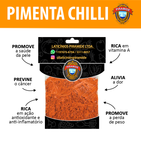 A Pimenta Chili 100% Pura – Pirâmide (50g) é um tempero natural de sabor intenso e picância marcante, ideal para quem busca dar mais personalidade e calor às receitas. Produzida a partir de pimentas selecionadas e moídas, ela é perfeita para temperar carnes, aves, peixes, feijoadas, sopas, molhos, pratos mexicanos, asiáticos e de outras cozinhas que valorizam o toque apimentado.